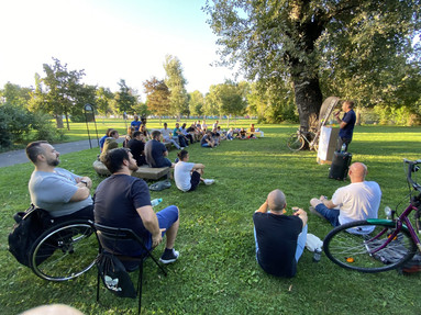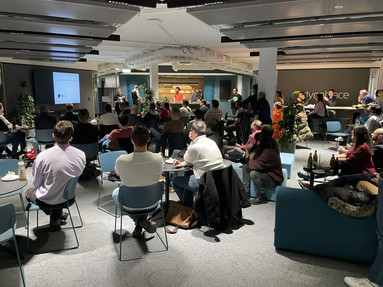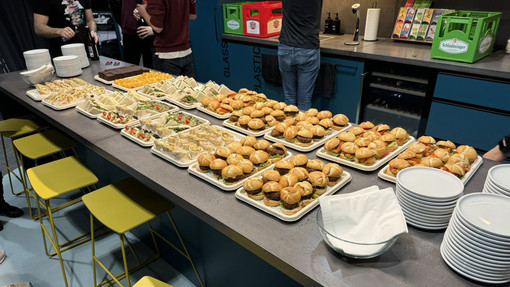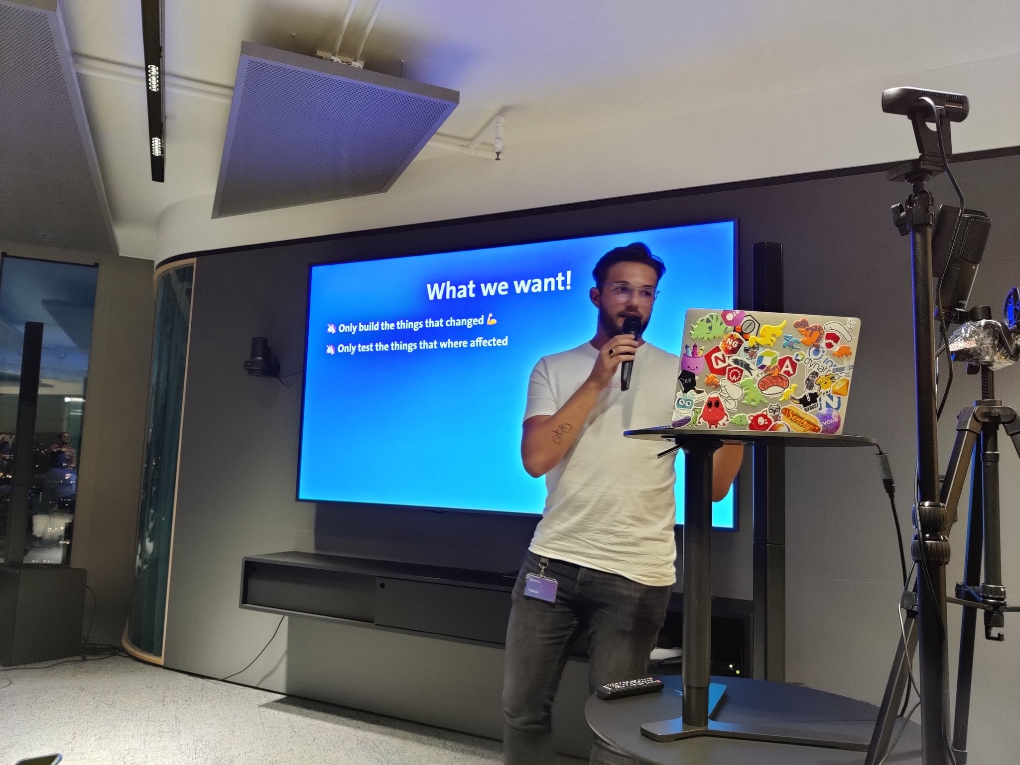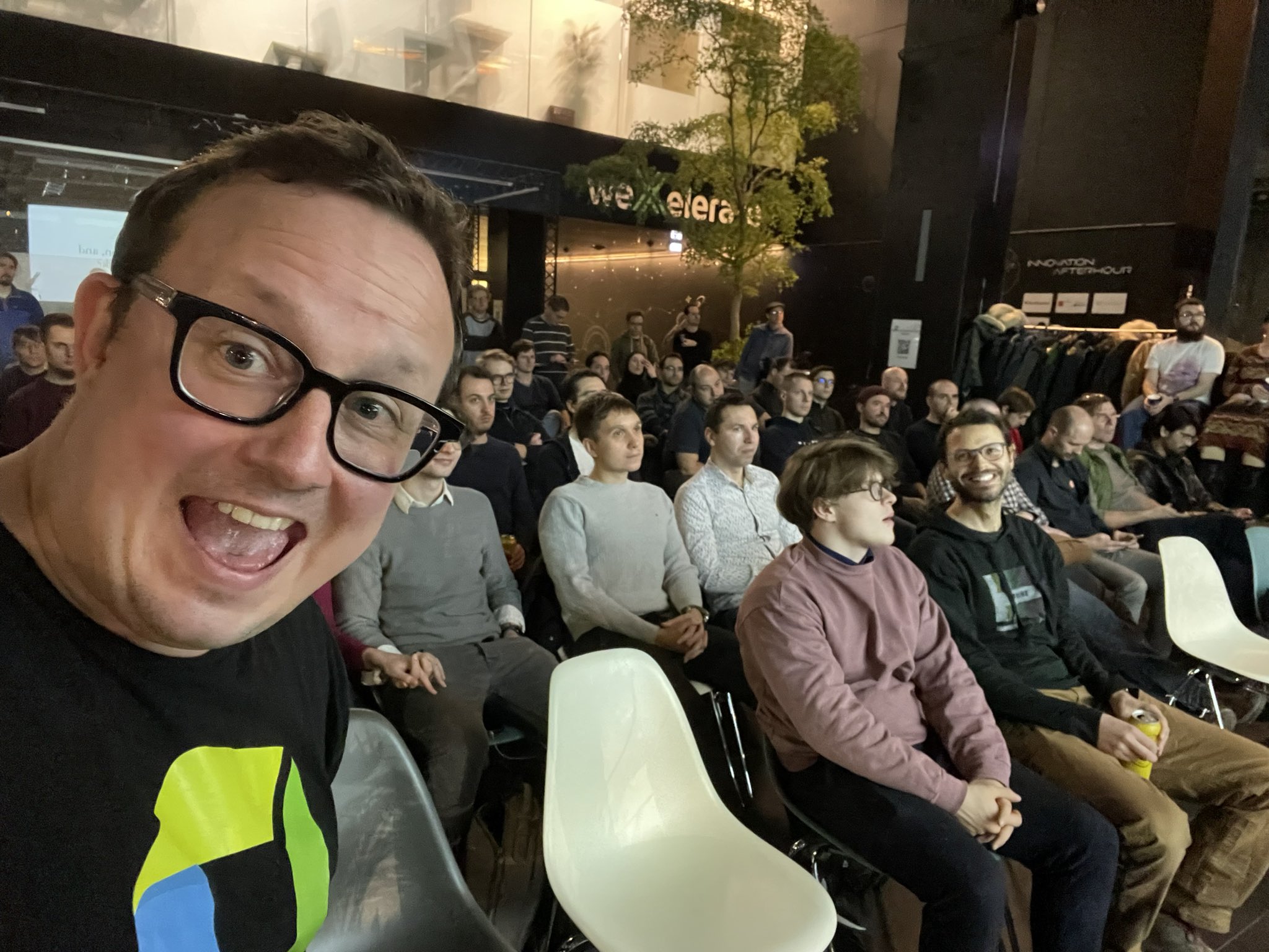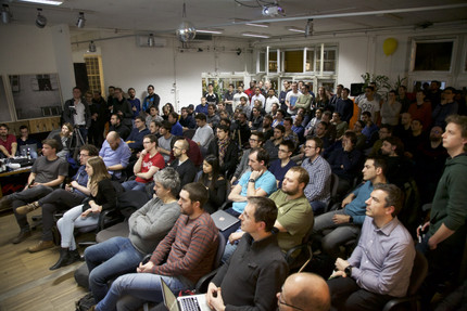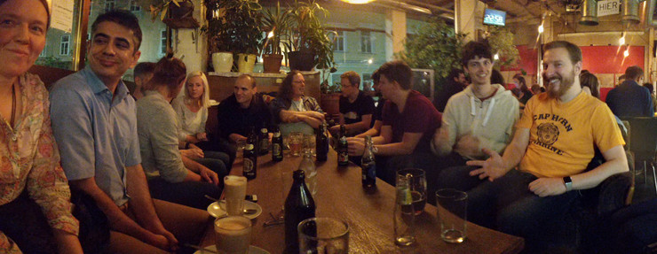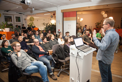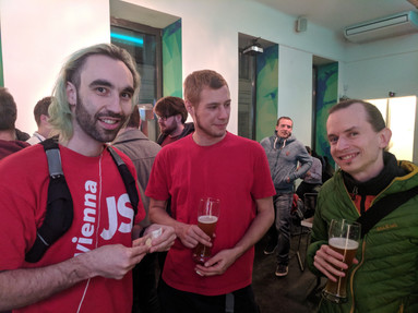 We've a monthly meetup (every last Wednesday of the month) where we have short presentations on JavaScript topics in English – everyone is welcome to join in and do talks and show us new stuff.